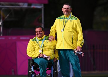 The national treasure of Australia’s Commonwealth Games village Cheryl Lindfield joined with Serena Bonnell to claim silver in the women’s Para-lawn Bowls Pairs B6-B8.